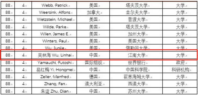 吴林海教授位列其中,排名88。国内共有9位学者入选。