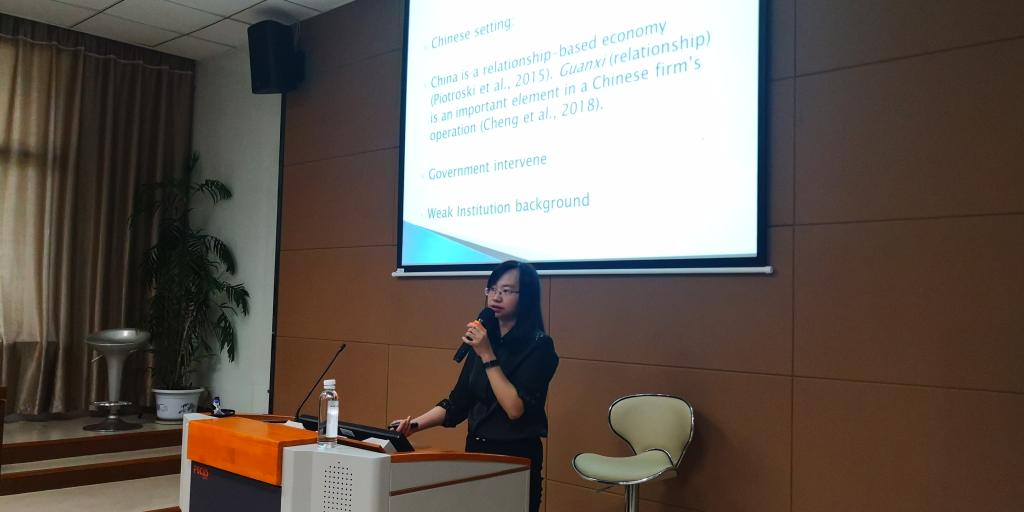 林老师结合自身当前研究主题,围绕 “企业政治关联与产品市场竞争态势”和“企业风险、政治关联董事聘任及其后果”两个重点内容展开系统地阐述,介绍她在这两个方向的研究思路、框架和研究进展。此外,她还介绍了企业政治关联与产品市场竞争态势研究的相关研究背景,并重点介绍了研究的主要假设,以及变量选择、指标含义和样本来源等内容,还对研究相关设计及稳健性进行分析,并对主要结果进行了介绍。