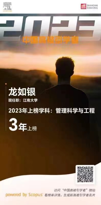 龙如银教授作为管理科学与工程学科的高被引学者入选该榜单!这也是龙如银教授继2021年入选后,连续3年入选“中国高被引学者”榜单!