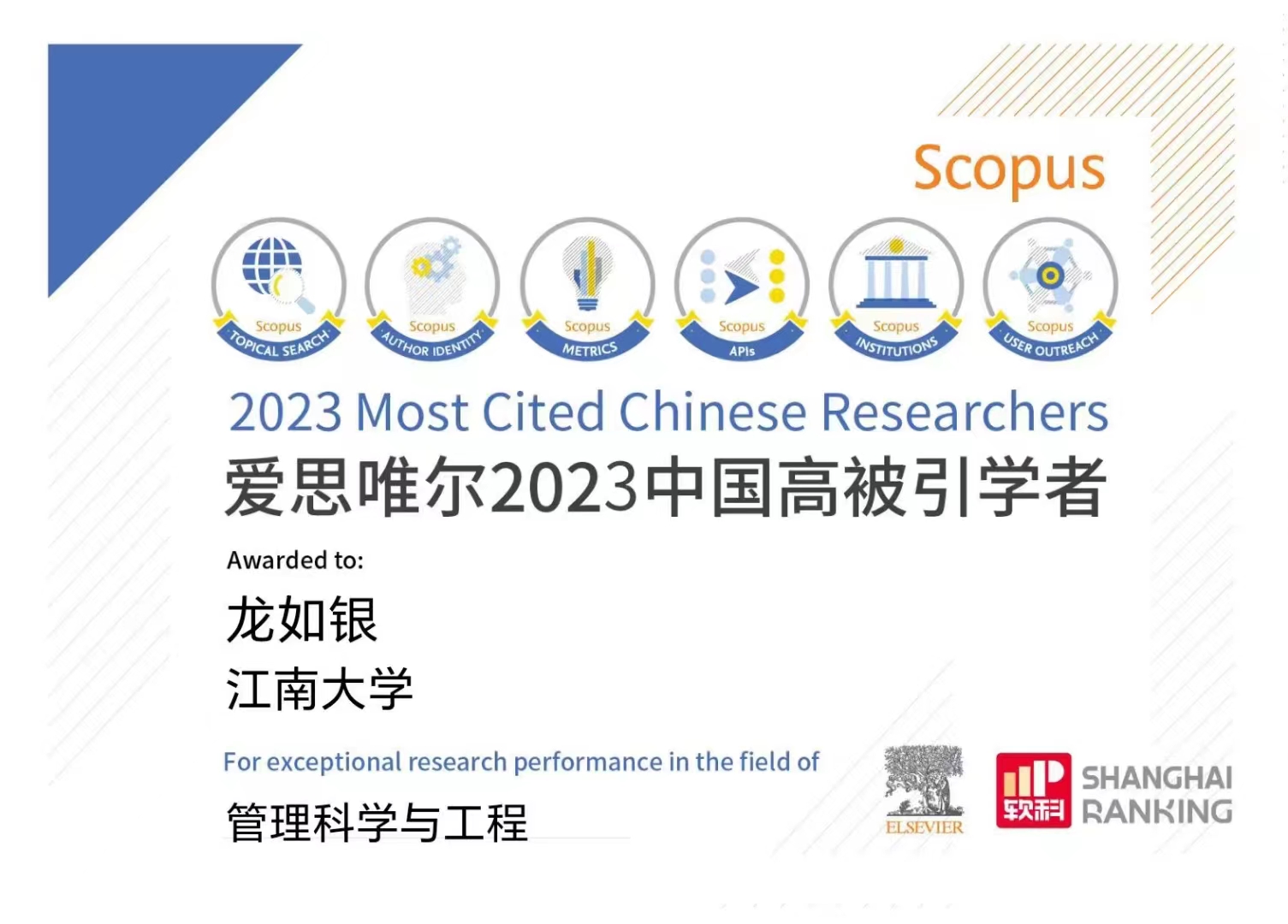 全球高被引学者榜单是全球性信息分析公司爱思唯尔(Elsevier)以全球领先的同行评议摘要引文数据库———Scopus作为中国学者科研成果数据来源,该数据库仅统计作为第一作者和通讯作者发表的科研成果,遴选出各学科最具全球影响力的中国学者名单。入选“高被引学者”榜单,意味着该学者作为第一作者和通讯作者发表论文的被引总次数在本学科的所有中国(大陆地区)研究者中处于顶尖水平,在其研究领域具有世界级影响力,其科研成果为该领域发展做出了杰出贡献。