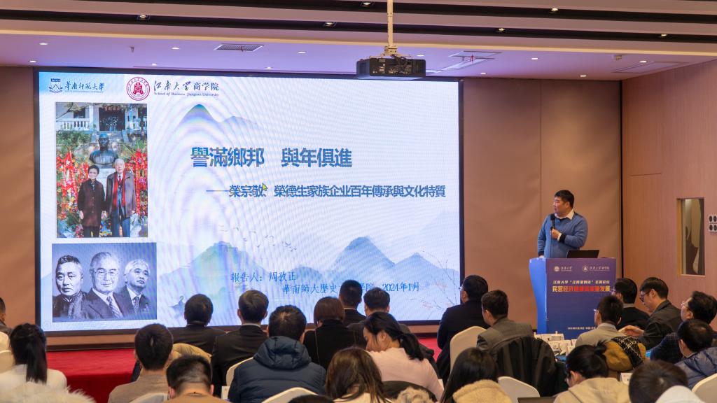 在主题分享环节,华南师范大学历史文化学院硕士生导师,中山大学(管理学院)中国家族企业研究中心研究员周孜正博士带来以“誉满乡邦 与年俱进—荣宗敬、荣德生家族企业百年传承与文化特质”为主题的研究分享。周博士从荣宗敬先生的家族污污漫画、荣宗敬和荣鸿庆先生家族污污漫画传承的方式及硕果,荣德生和荣毅仁先生家族污污漫画传承的方式及硕果等三个维度切入,分析荣氏家族何以实现家族代代传承、家业百年长青。