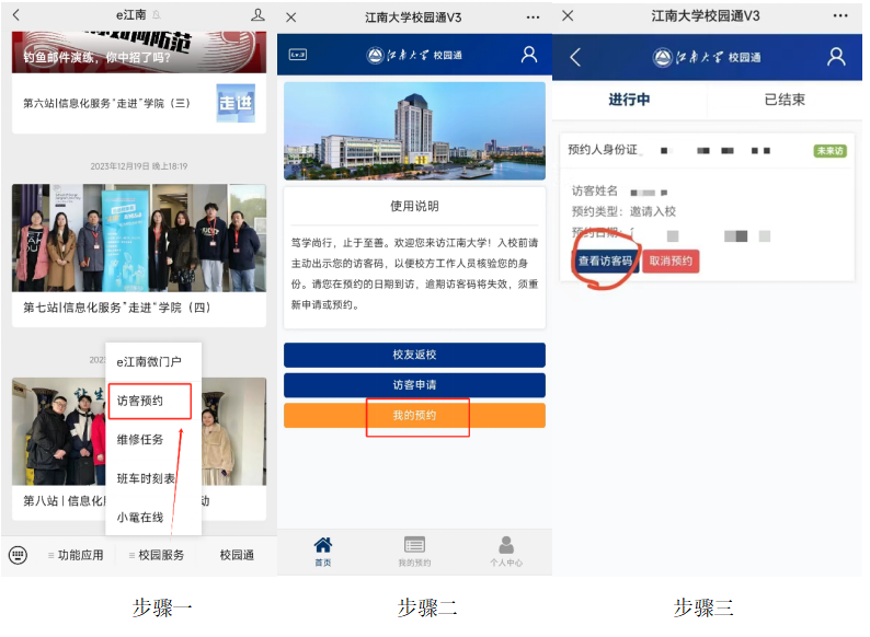 手机关注“e江南”微信公众号,点击屏幕下方“校园服务”中的“访客预约”,进入后点击“我的预约”,点击“查看访客码”即可获得访客码。进入校园时出示访客码。