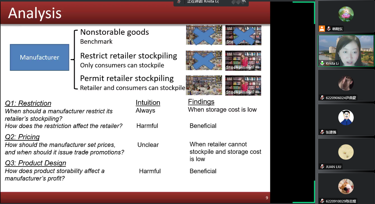 随后,李教授分享了研究得到的几个重要发现。例如,过去人们认为制造商一定要限制零售商的囤货行为,而研究却表明只有在存储成本比较低的情况下,制造商才需要限制零售商囤货。再比如,以往制造商不清楚什么时候要促销,而本研究发现当零售商不能囤货并且产品的存储成本比较低的情况下,制造商可以采取促销。她展示并讲解了模型和假设,运用博弈论的方法,详细分析了“制造商允许零售商囤货”和“不允许零售商囤货”、“产品存储成本高”和“产品存储成本低”、“制造商线性定价”和“二重定价”等多种情境,博弈分析的结果证明了以上发现,得到了有价值的管理启示。