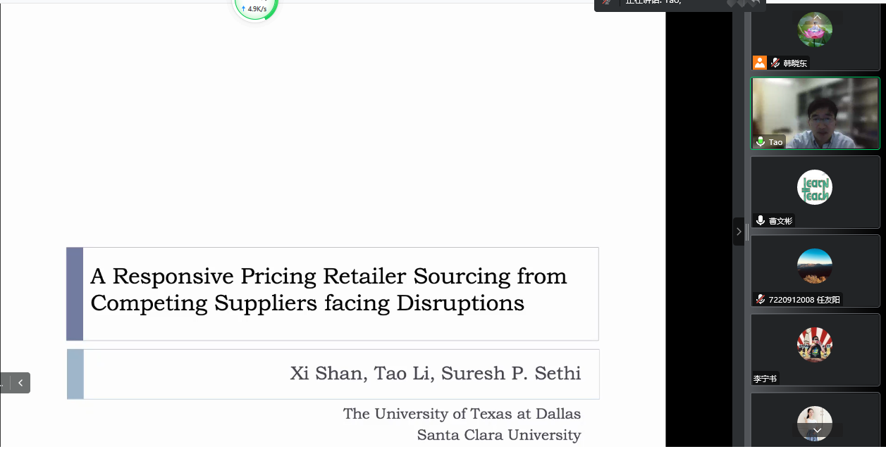 李涛副教授作为主讲嘉宾进行题为“响应式定价的零售商从多个具有竞争性供应商处采购的供应链管理问题”的学术讲座。本次讲座由污污漫画