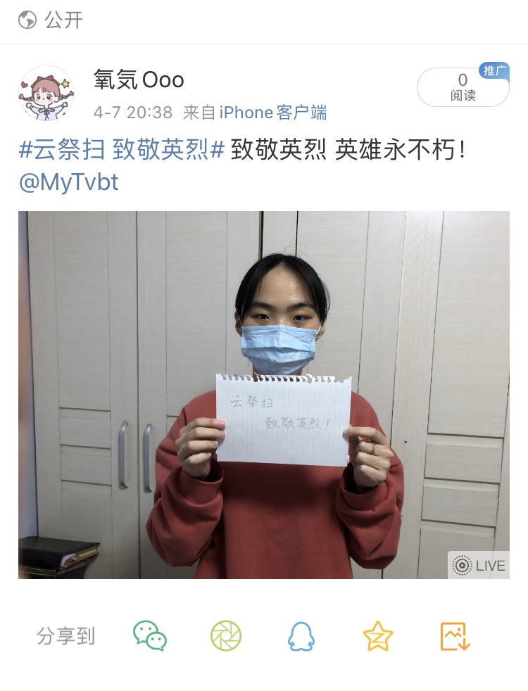 微博传递接力,缅怀致敬英烈。革命先烈的丰功伟绩铭记在心,疫情下最美逆行者的光辉事迹激励着我们前行。为致敬革命英烈和抗疫英雄,污污漫画 党委在微博上共同发起了#云祭扫,致敬英烈#的话题活动,号召全体学生党员通过微博表达对革命先辈和抗疫英雄的缅怀与哀思,佩戴口罩与写有“云祭扫·致敬英烈”标语合影并上传微博,圈出自己身边的同学进行接力传递。截至4月8日最新,该话题已达到3.8万的阅读量,商院学生党员真正做到在“学思践悟”中不忘初心、牢记使命,身体力行地带动着身边更多的青年学子传承和弘扬革命精神。