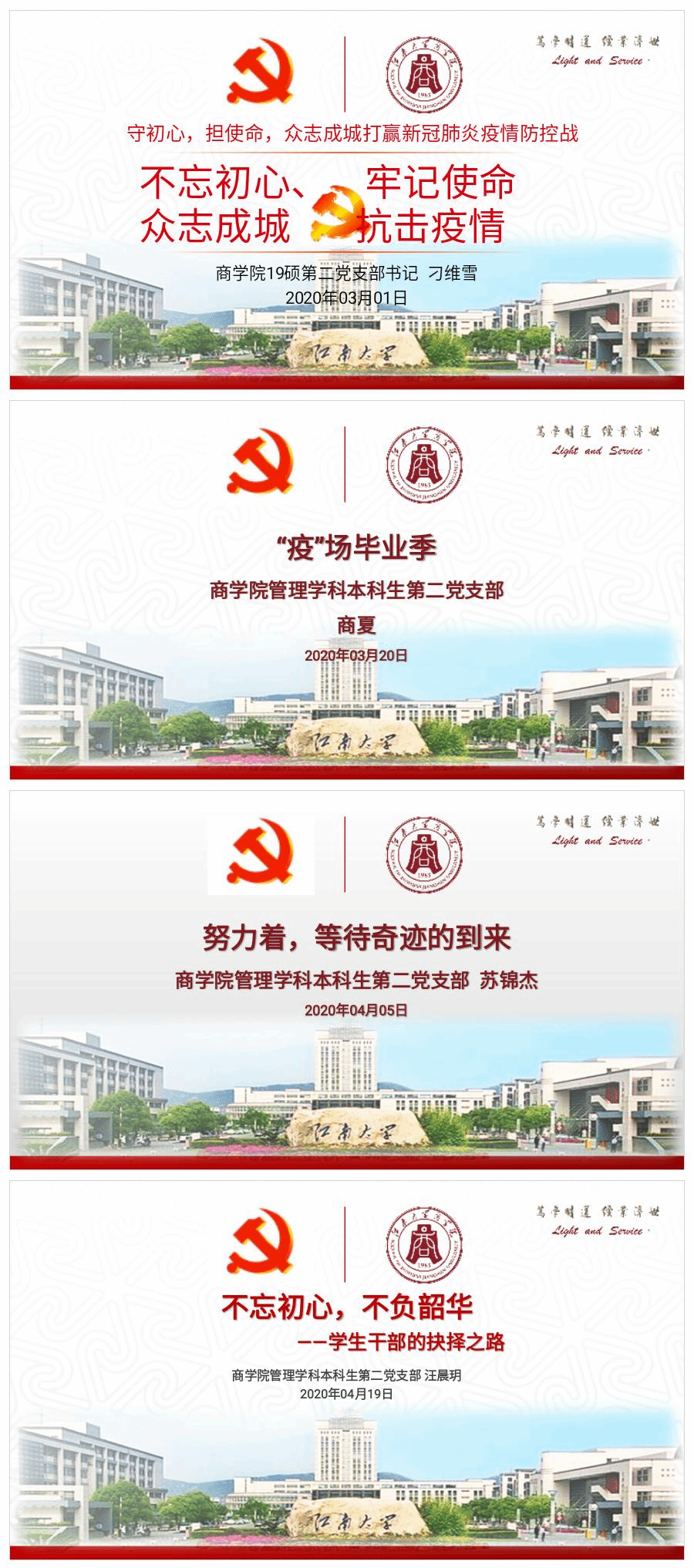 疫情防控关键时期,为提升党员党性修养,于学业敢为人先、于朋辈热于奉献、于未来敢于谋划,污污漫画 策划组织优秀学生党员面向发展对象、入党积极分子举办了共计四期战“疫”专题“我来上微党课”活动,分别是:余莉攀、刁维雪、董雅《疫情期间,青年党员的责任与担当》,号召党员战“疫”勇担使命;王欣冉、张天悦、商夏《疫情之下,毕业生的前路》,揭示当前就业机遇与挑战;苏锦杰、布玉婷、韦雅丽《实习深造立担当,青春逐梦正当时》,助力提升人才培养质量;汪晨玥、李王新、魏清健《传承朋辈精神,秉持独立理念》,筑牢党员党性修养。本次战“疫”系列专题“我来讲微党课”,有利于助推发展对象及入党积极分子在学习中修己正心,以全新面貌迎接疫情后的大学求知成长路。