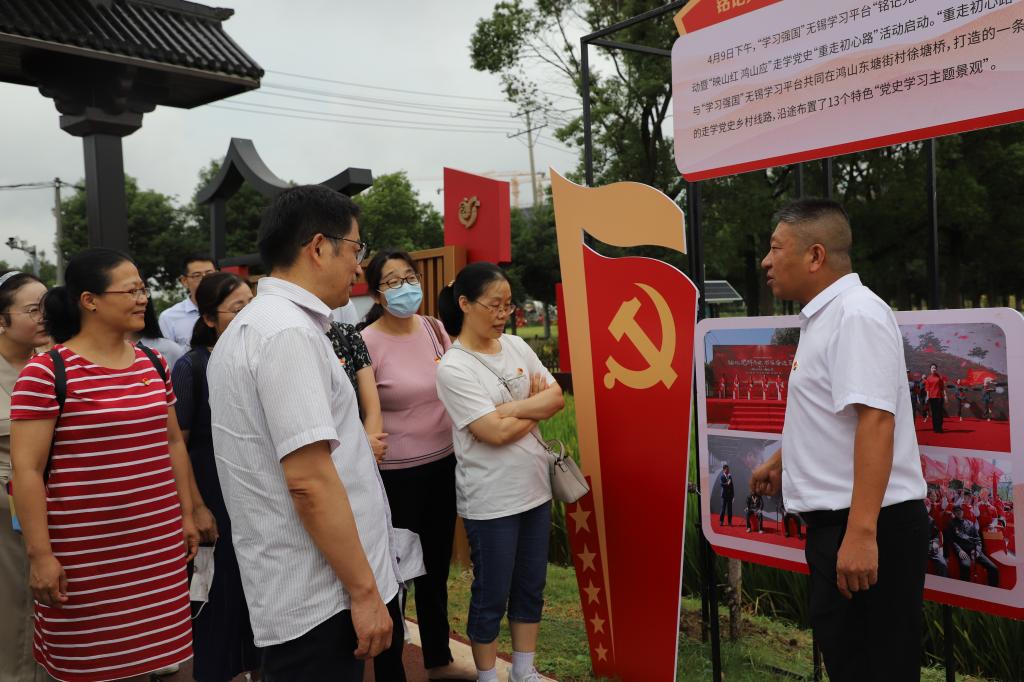党委书记徐锡清、副书记徐静带领学院教工党员一行50人前往无锡鸿山街道东塘街村,体验“重走初心路”学党史特色乡村线路,开展沉浸式的党史学习教育主题党日活动。鸿山街道东塘街村党支部书记、主任周伟陪同考察学习。