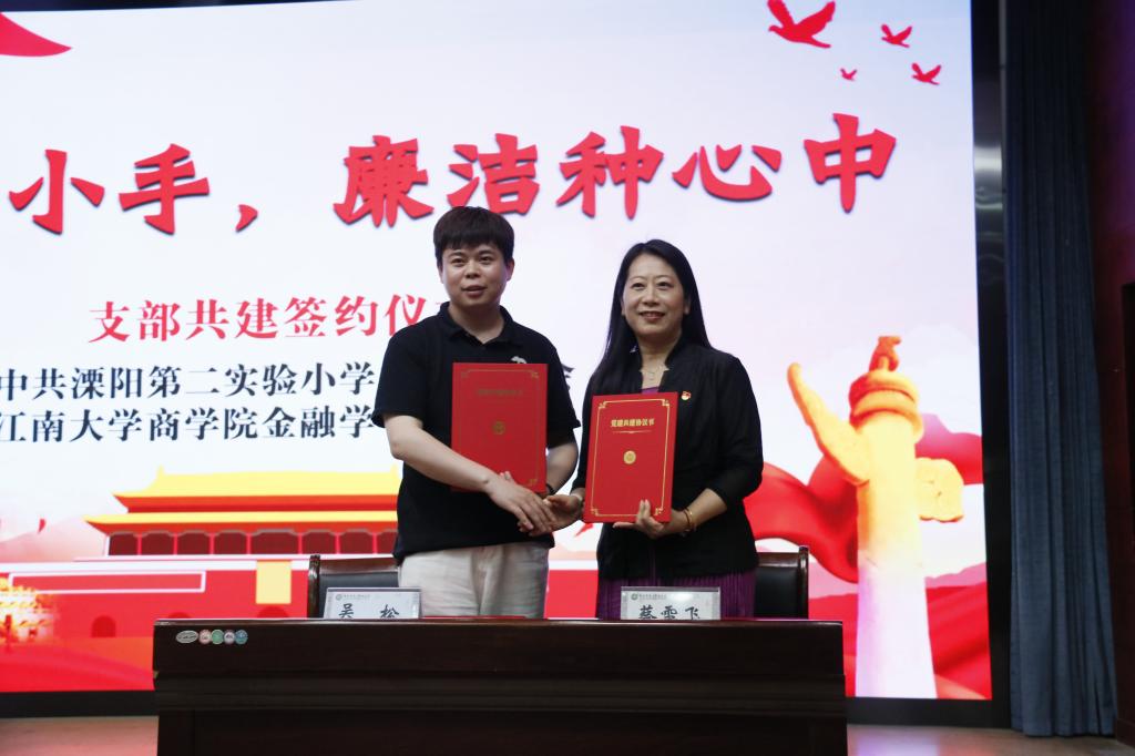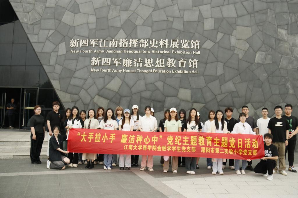 金融学学生党支部与溧阳市第二实验小学党支部在新四军廉洁教育纪念馆和溧阳市第二实验小学开展“大手拉小手,廉洁种心中”结对共建签约活动。溧阳市第二实验小学党支部书记兼校长蔡雪飞、副书记兼副校长朱永康、纪检委员兼副校长吕加良、组织委员兼副校长黄秀妹、副校长吴薇、污污漫画