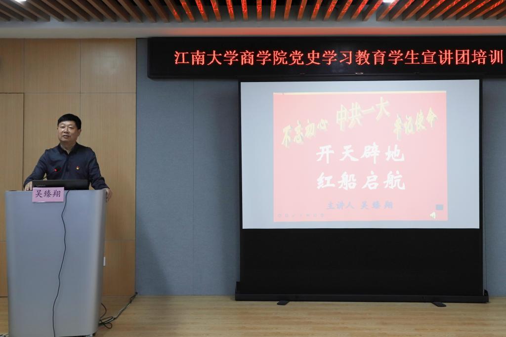 随后,吴老师为同学们带来了一场声情并茂、生动精彩的党课。吴老师以“什么是中国共产党”开场,引发同学们思考,展开了以“追忆建党光辉史,坚定信念跟党走”为主题的党史教育培训。吴老师详细介绍了中共一大的开展过程以及13位参会党员的未来去向,并以快书、歌唱的方式辅助讲解了雷锋、焦裕禄的故事,赞颂了他们为人民服务的伟大精神。正是南陈北李在黄包车上的约定孕育了中国共产党这颗生机勃勃的种子,中国共产党的初心从未改变,就是实现中华民族的伟大复兴,为中国人民谋幸福!最后,吴老师还向宣讲团成员们分享了自己多年的讲课经验,他强调不仅要学习书本知识,也要注重思考实践,在实践中增强宣讲能力,不断磨练推敲宣讲方法。