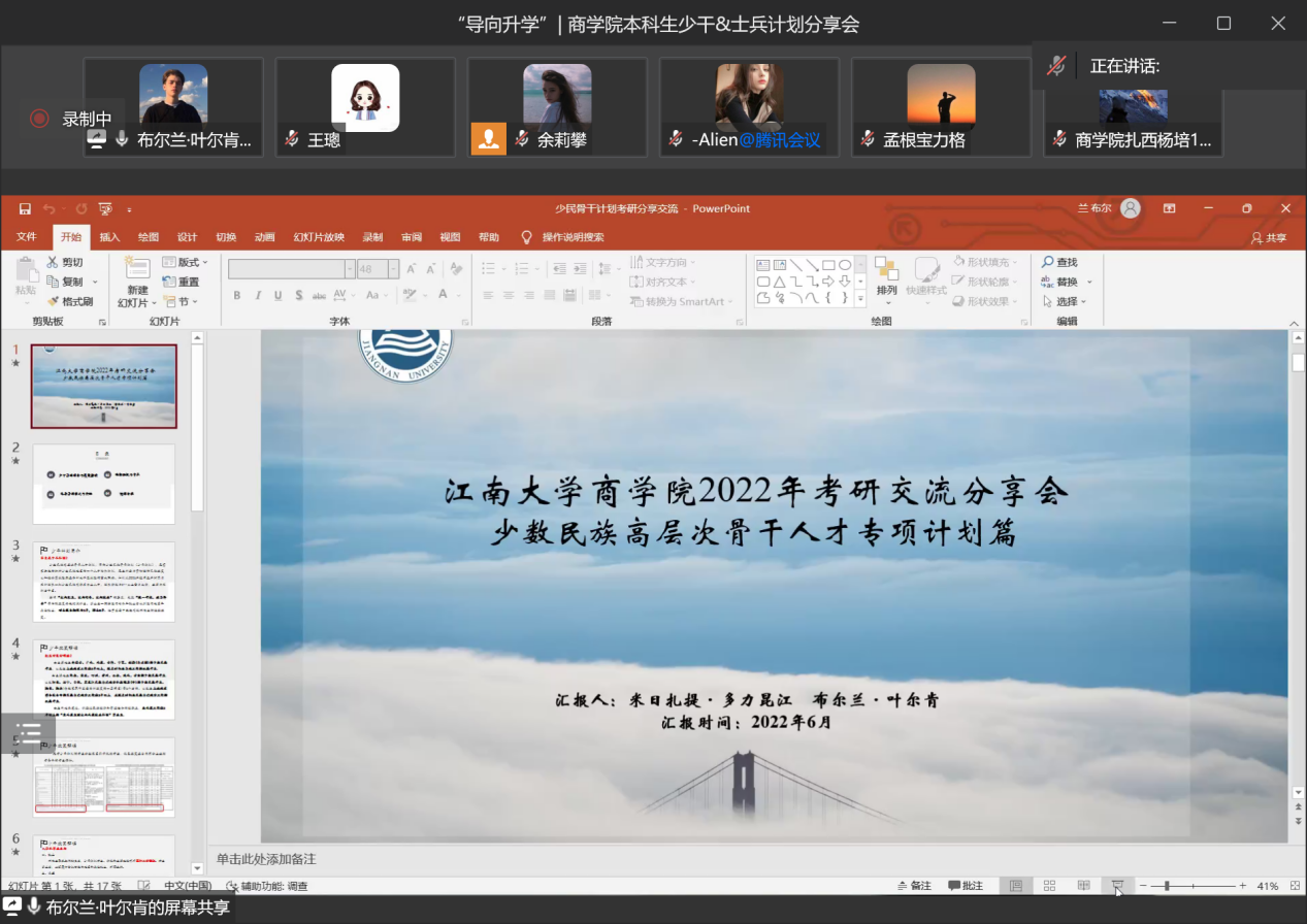 接着,三位嘉宾依次进行分享。米日扎提·多力昆江同学和布尔兰·叶尔肯同学分享了自己备考“少数民族骨干计划”的经验与心得。米日扎提·多力昆江同学从“如何选择学校专业”和“如何备考”两个方面为2022年考研的学弟学妹们做了经验分享和指导。首先,他讲到,考生确定报考学校和专业要从自身实际出发,同学们要根据自己未来职业规划、目前的学习成绩和复习效率,考虑是否要报考本校、是否跨专业、是否尝试保研等。其次,他还对考试内容和形式作了介绍,鼓励同学们确定明确清晰、能够实现的考验目标,制定合理健康的备考计划。同时,他还特别提醒同学们要注意报名备考时间节点和重点事项,鼓励同学们相互合作、共同进步。最后,代表污污漫画 往届研究生学长学姐对2023届考生表达了美好祝愿。