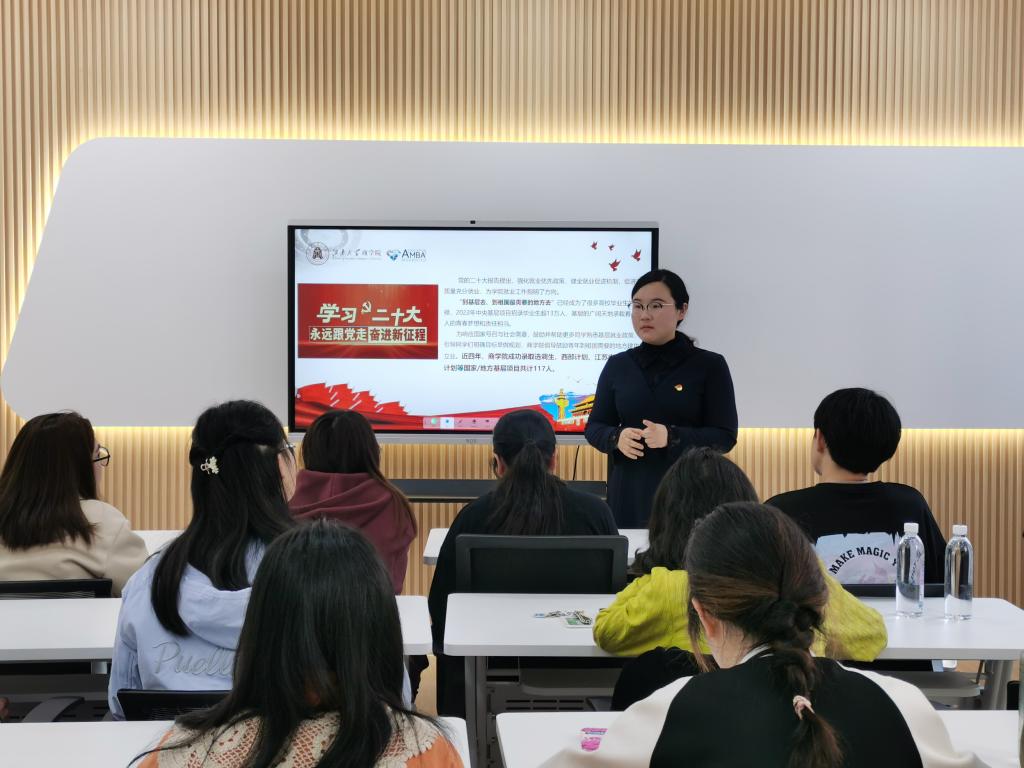 分团委书记王璁围绕项目简介、招募选拔、政策保障、服务管理等方面详细解读国家/地方基层项目情况,并向广大青年学子发出号召,积极踊跃参与国家/地方基层项目,在全面实施乡村振兴的新征程中,挥洒青春和热血。