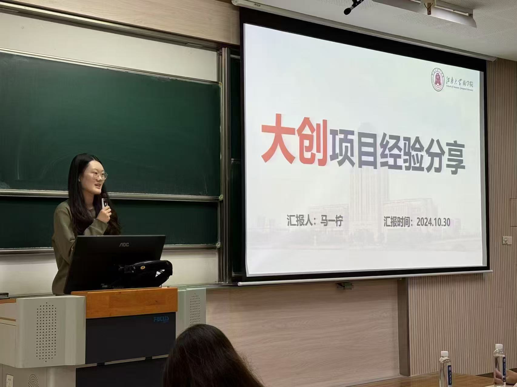 国家级大学生创新创业训练计划项目负责人马一柠结合自身丰富的项目经验,详细分析了创新项目和创业项目二者之间的差异,并着重强调了各阶段工作及注意事项。国家级大学生创新创业训练计划项目负责人孙锦阳提出在大创项目领域的“三胜诀”——思维胜、视野胜、素养胜,以及“三难咒“——选题难,落实难,细节难,并强调在项目进行过程中要将创新的想法与有创意的实践相结合。省级大学生创新创业训练计划项目负责人陈亭廷分别从课题的选择、队友的找寻与分工、项目撰写要求三个方面阐释,重点强调了在选题过程中要与导师加强联系沟通。经验分享干货满满,现场氛围融洽。