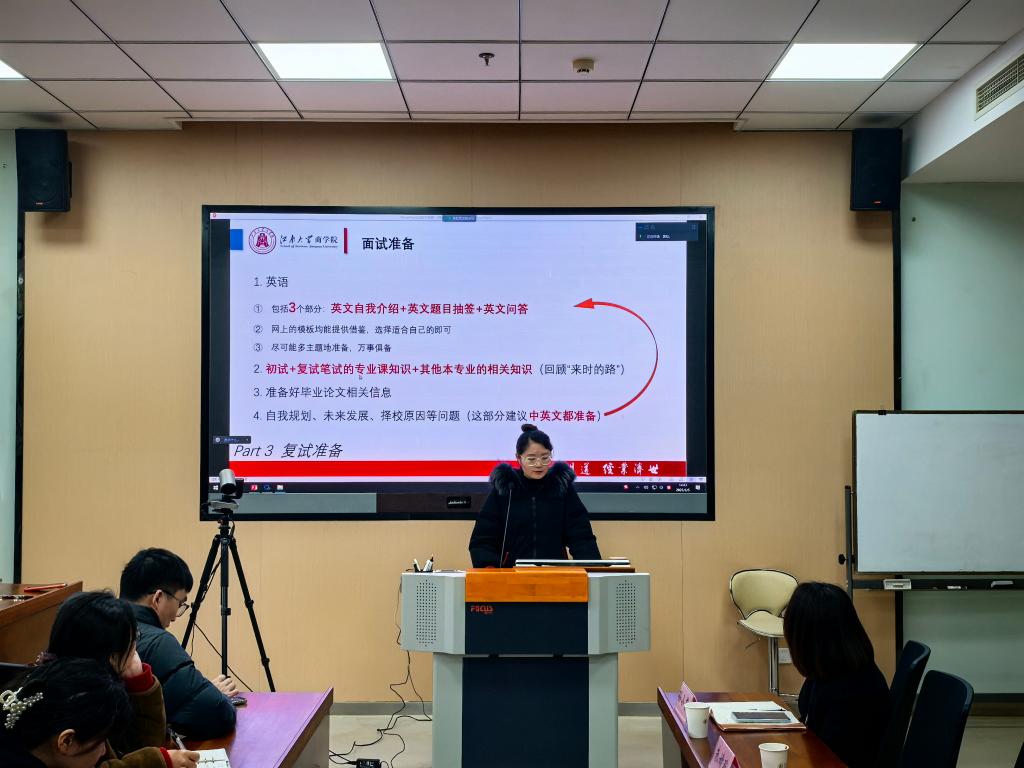 成功考取北京师范大学国际商务专业硕士的陈可馨同学以自身考研经历为例,对复试的院校考情进行了详细梳理,强调要及时关注目标院校的复试要求和动态信息,专业课的学习和面试时的输出表现是考研复试成功的关键。她提醒同学们不必过于紧张,可通过模拟面试、反复练习、注重仪容仪表等方式从容地面对复试。最后她从自我介绍准备、英语口语、专业课问答、综合素质考察等方面,向同学们分享了复试技巧以及心态调整方式。