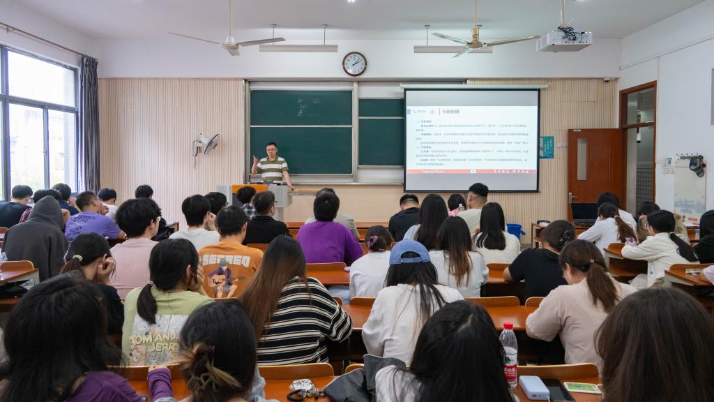 雷淳智为在场同学系统分享了考研院校选择、报考流程与备考策略。他结合个人备考经历,从院校选择动机、报考流程细节、管综复习规划等多个维度展开讲解,并特别强调真题训练与心态调整的重要性。他鼓励同学们要坚持行动、合理择校、保持锻炼,以踏实心态沉着应考。