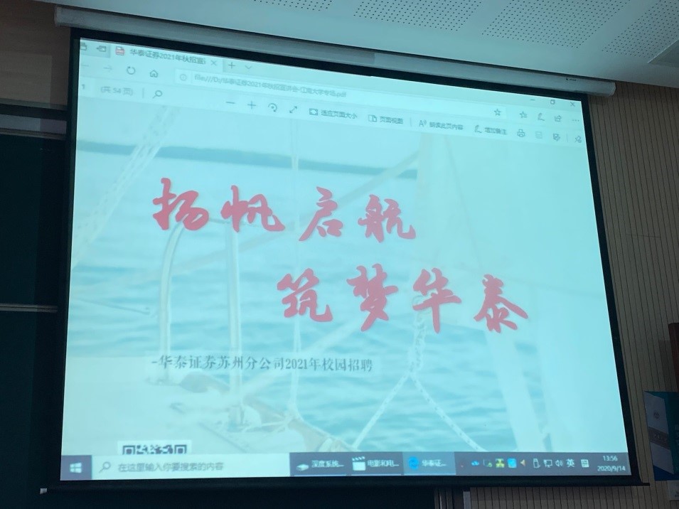企业家辅导员主席团副主席刘晓冰老师来校举办以“扬帆启航、筑梦华泰”为主题的校园招聘宣讲会,辅导员徐雅静、孙旭媛及30多名应届毕业生参与活动。