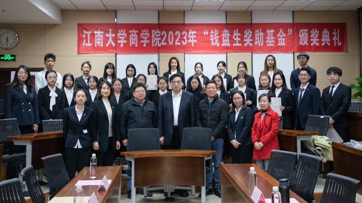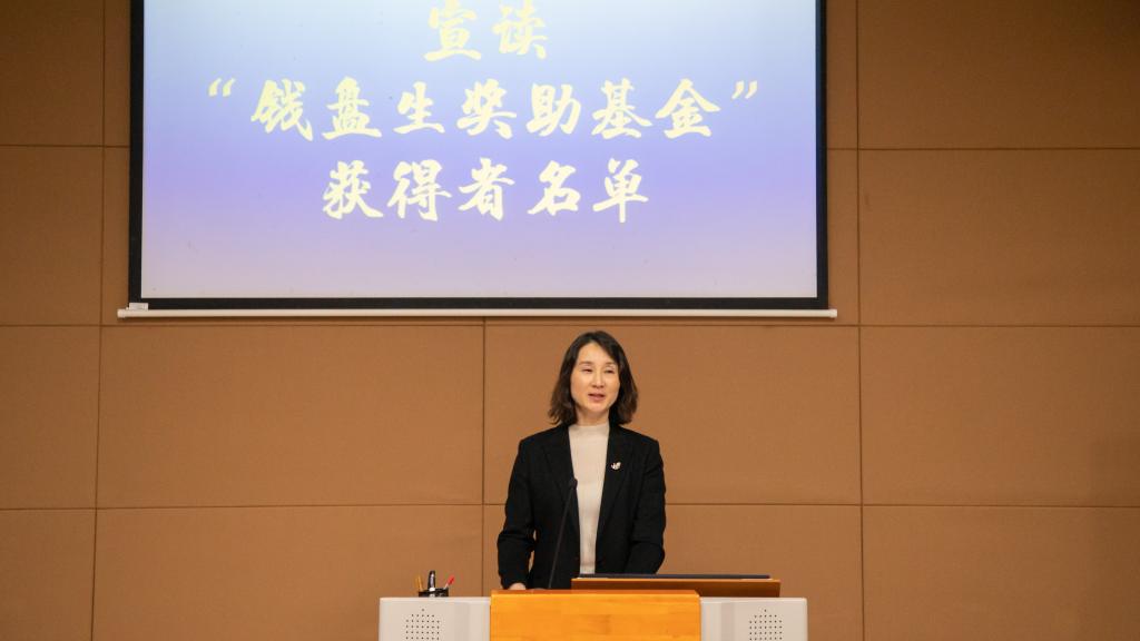 单筱婷宣读了2023年“钱盘生奖助基金”获奖学生名单。安楠等17位同学获钱盘生奖学金,郭超静等8位同学获钱盘生助学金。颁奖仪式上,钱盘生董事长为获奖同学颁发了荣誉证书。