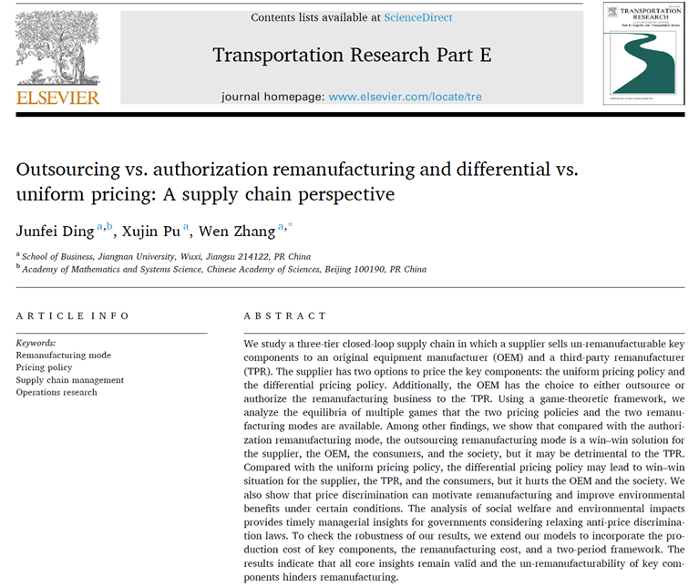 近日,国际权威期刊《Transportation Research Part E: Logistics and Transportation Review》正式刊发了污污漫画 丁军飞副教授、浦徐进教授和张文副教授共同完成的论文“Outsourcing vs. authorization remanufacturing and differential vs. uniform pricing: A supply chain perspective”。