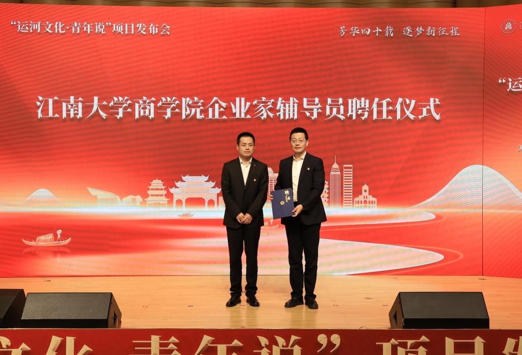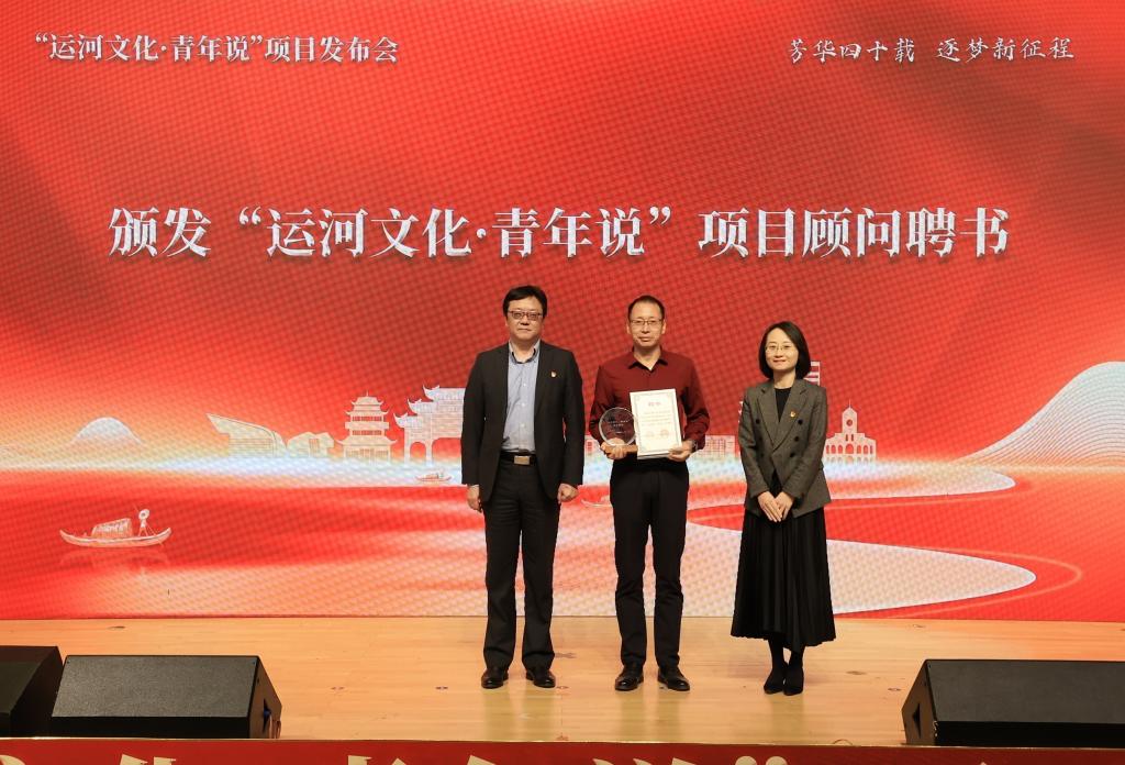孙小芳和张曦为刘大禹颁发“运河文化·青年说”项目顾问聘书。