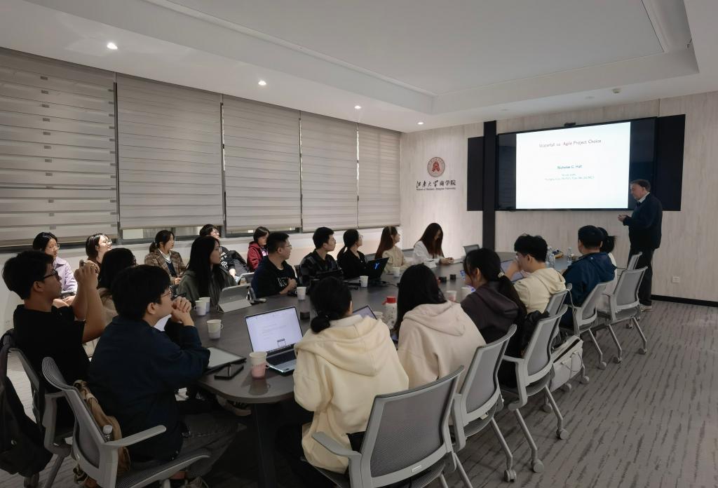Nicholas G. Hall教授,作题为“Waterfall vs. Agile Project Choice”的学术报告。讲座由管理科学与工程系徐淑玲博士主持,管工系教师和研究生二十余人参加本次活动。