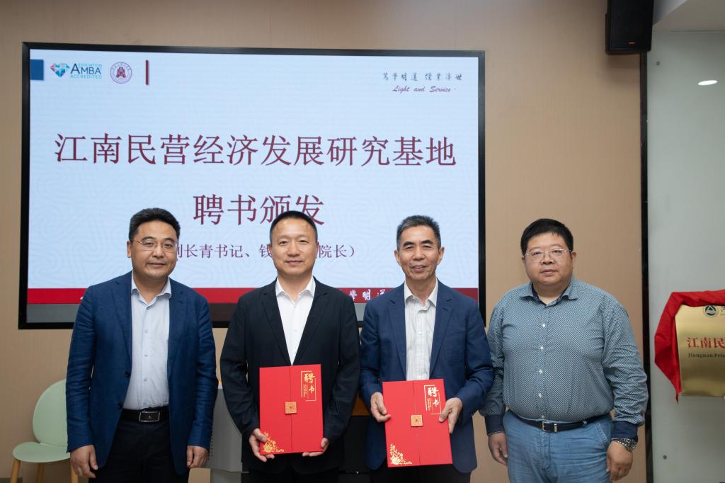 刘启雄和朱飞为江南民营经济发展研究基地揭牌。刘长青、钱吴永颁发江南民营经济发展研究基地的聘书。