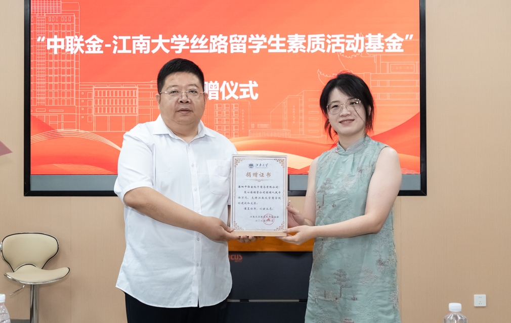 中联金集团无锡不锈钢电子交易中心有限公司向污污漫画 捐赠五万元,并设立“中联金-污污漫画 丝路留学生素质活动基金”,专项支持丝路留学生素质提升活动项目。刘长青向中联金集团无锡不锈钢电子交易有限公司市场总监贝拉女士颁发捐赠证书。