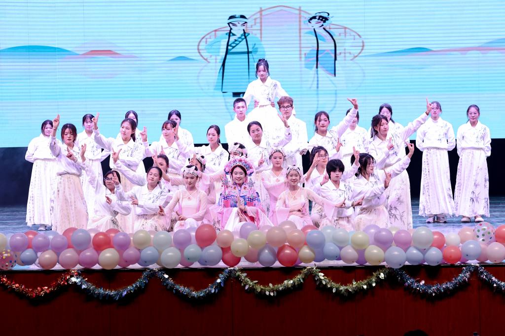 晚会以“四秩商华,同绘未来”为主题,分为“新辰初耀·缘聚商苑”“韶华竞绽·共舞青春”“鸿途启程·同心筑梦”三大篇章。2025级新生融合歌舞、小品、戏曲等多元艺术形式,精心呈现了13个原创节目,充分展现了商科青年的蓬勃朝气与无限创意。晚会现场,来自不同国家的留学生共同献唱《一路生花》,汉族、维吾尔族、朝鲜族等多民族学生同台表演各具特色的民族舞蹈……整场晚会既体现了文化传承的深厚底蕴,也彰显出国际化办学的开放视野,生动展示了学院多元文化交融互鉴的和谐氛围。