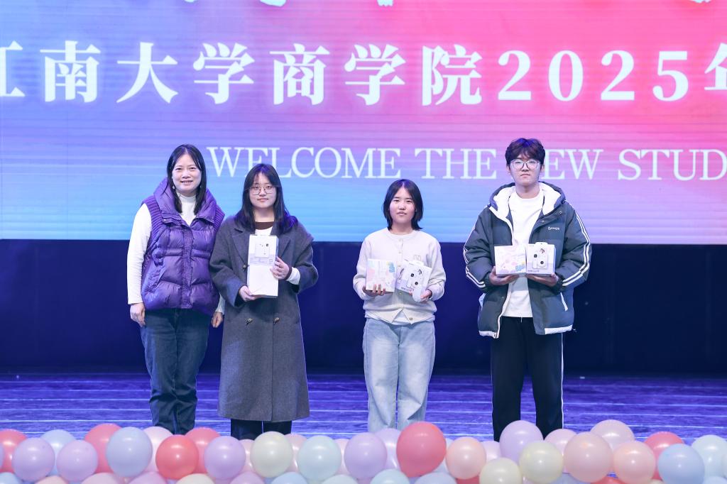 党委书记刘长青,2024-2025年“我最喜爱的企业家辅导员”代表叶惠、孙爱军先后为幸运抽奖获奖同学颁发奖品,并合影留念。