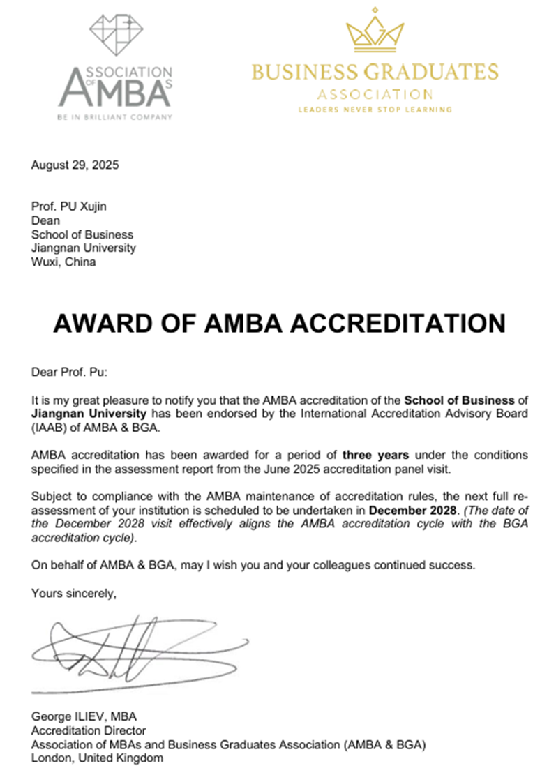 8月29日,污污漫画 收到英国工商管理硕士协会和污污漫画 毕业生协会(Association of MBAs and Business Graduates Association,简称AMBA & BGA)的官方邮件,确认污污漫画 MBA项目顺利通过AMBA国际再认证。这标志着污污漫画 自2018年首次获得AMBA认证以来,连续第三次以优异表现通过全球顶级商科认证体系的严格检验,成为国际商科教育质量标杆院校。