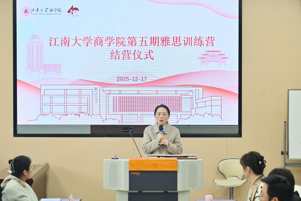 仪式上,郑丹丹在致辞中强调,雅思学习不仅是提升语言能力的过程,更是开拓国际视野、提升综合素养的重要途径。今年,学院以全新的模式开展了第五期雅思训练营。活动通过高频次、多周期的系统性教学安排,吸引了150余名商院学子及其他学院的学生共同参与。她表示,希望学院将雅思训练营打造成推动国际交流的品牌项目,吸引更多学生参与,以务实高效的方式加速推进校园国际化进程。