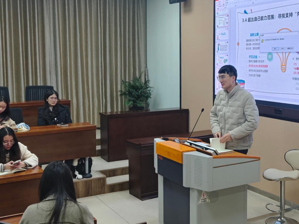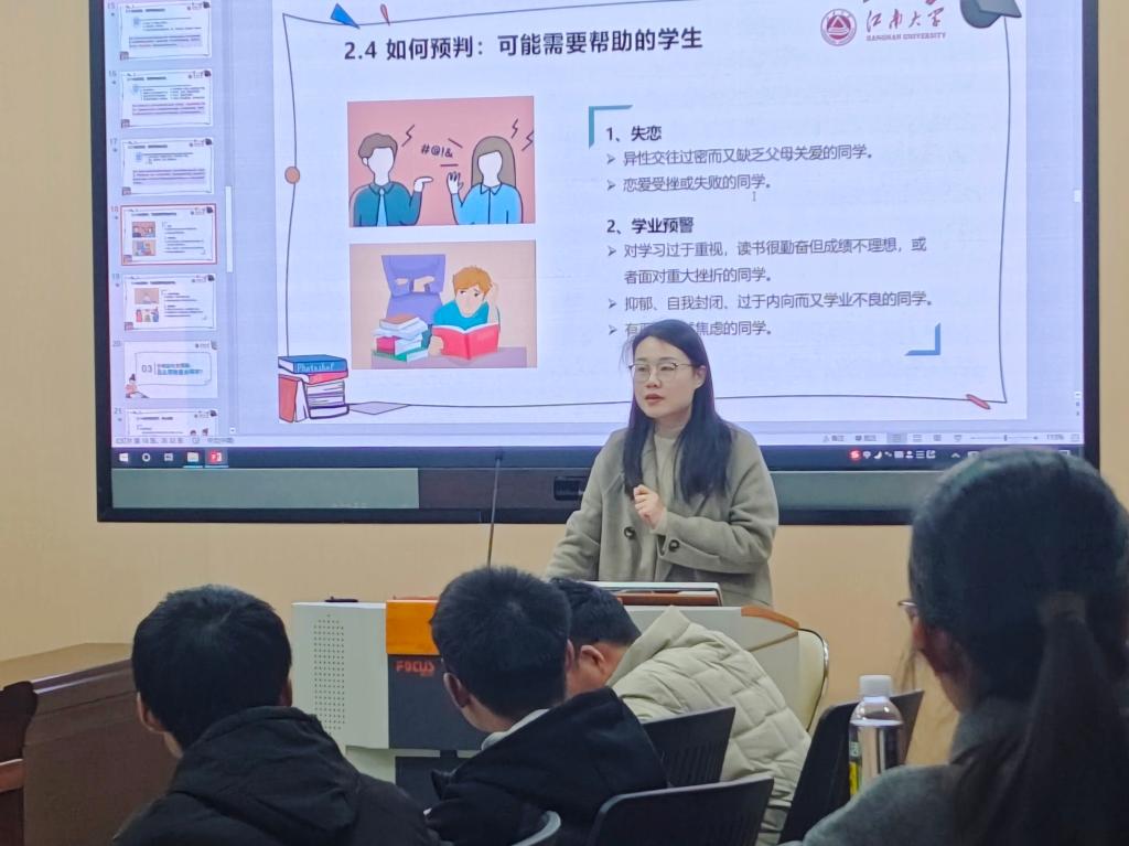 田雨详细解析了心理委员和寝室长的岗位职责,厘清了两者工作边界与协作流程,并着重强调了信息保密原则。同时,她结合新生常见的适应焦虑、人际交往等问题,梳理了识别方法与应对策略,指导心理委员精准把握同学心理状态,提升主动关怀能力。
