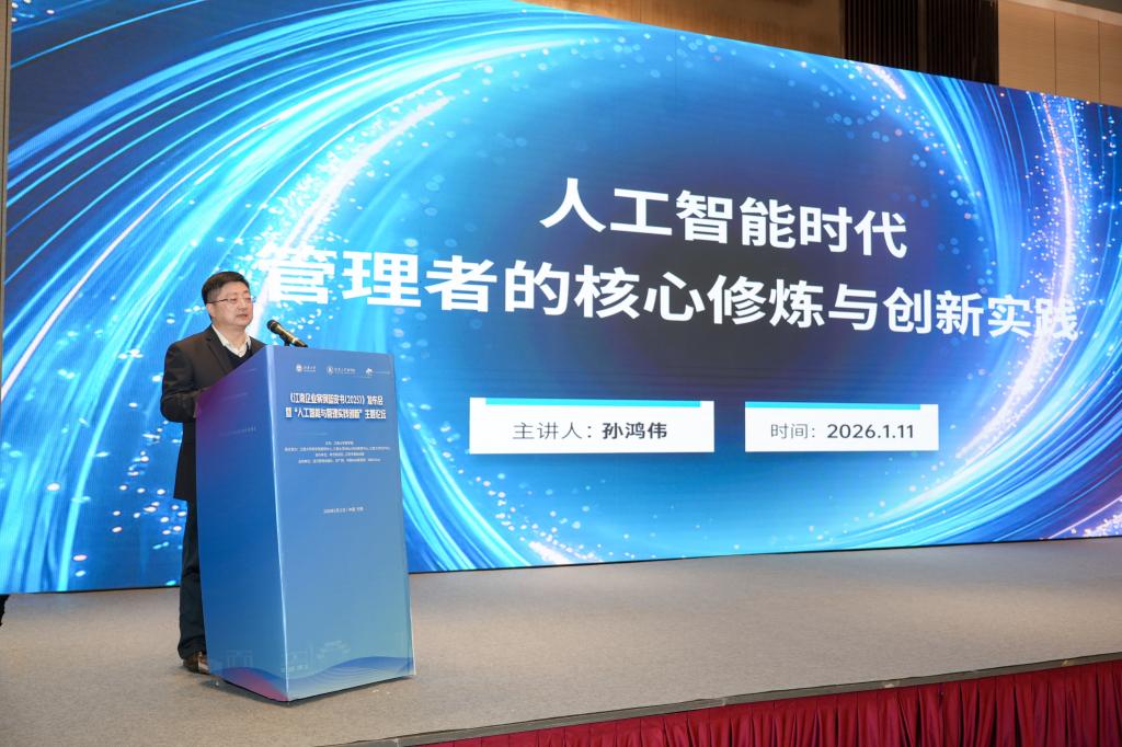 在主题分享环节中,海太半导体(无锡)有限公司董事长兼总经理孙鸿伟带来 “人工智能时代管理者的核心修炼与创新实践”为主题的分享。他从人工智能时代的拷问、管理者的选择逻辑、核心修炼驱动创新实践等三个维度切入,详细剖析了人工智能时代管理者的修炼与创新实践路径。