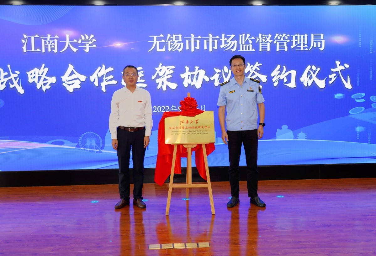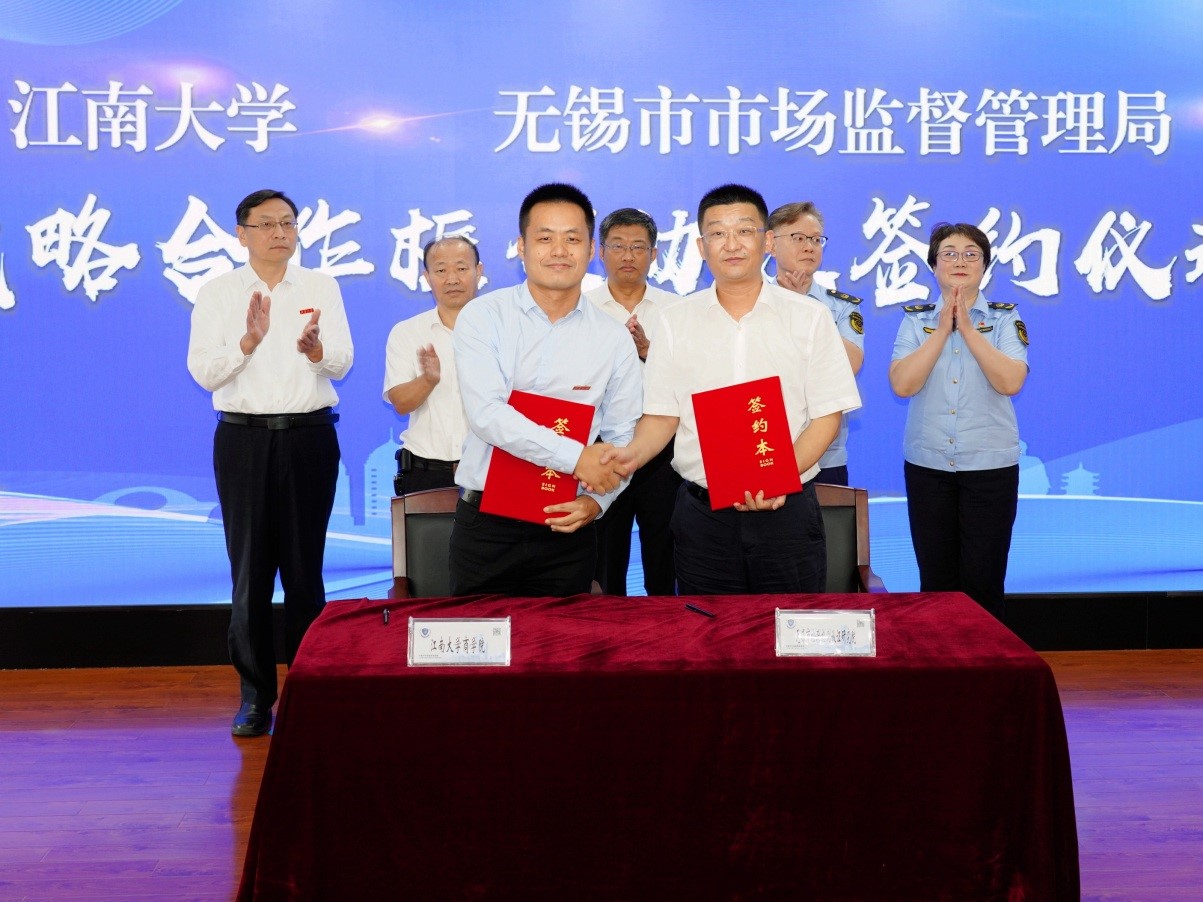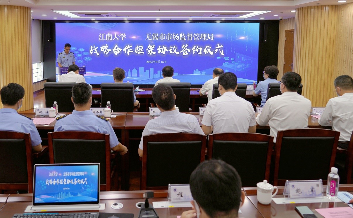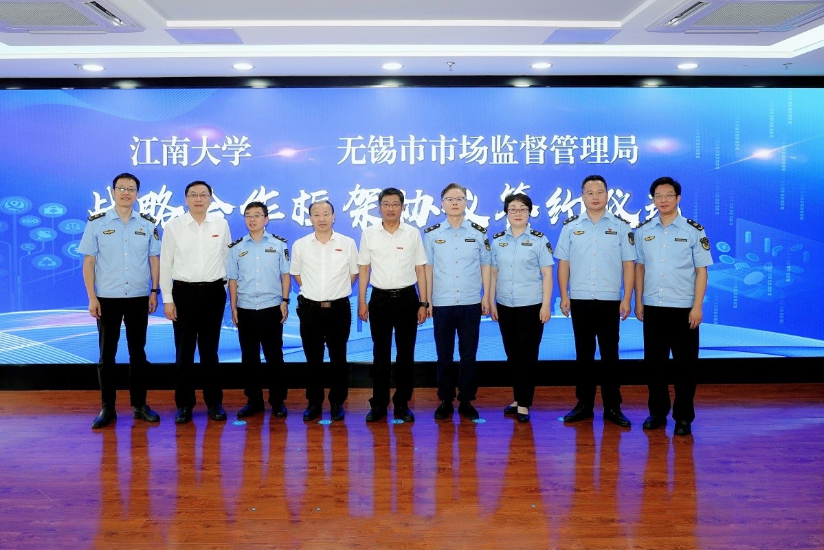 与无锡市市场监督管理局举行战略合作框架协议签约仪式。校长陈卫、副校长顾正彪、吴正国与市场监管局局长周建辉、副局长于文霞、邹伟明、胡勇、叶建平、总工程师谢刚等出席仪式。