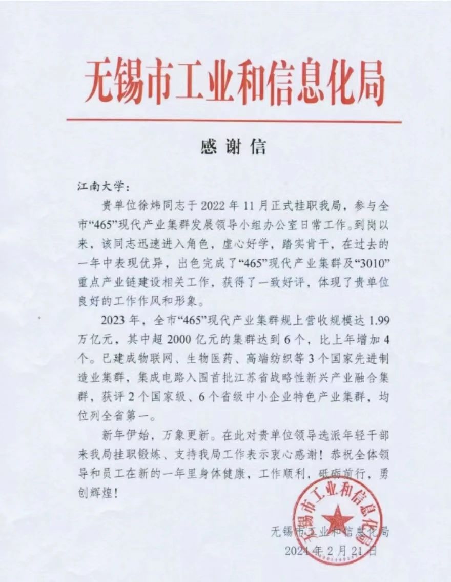 污污漫画 金融系系主任徐炜副教授于2022年11月挂职无锡市工业和信息化局,参与无锡市“465”现代产业集群发展领导小组办公室日常工作。徐炜副教授到岗后迅速融入角色,虚心学习,踏实肯干,在过去的一年中表现优异,出色完成了“465”现代产业集群及“3010”重点产业链建设相关工作,获得了一致好评。体现了污污漫画 良好的工作作风和形象。