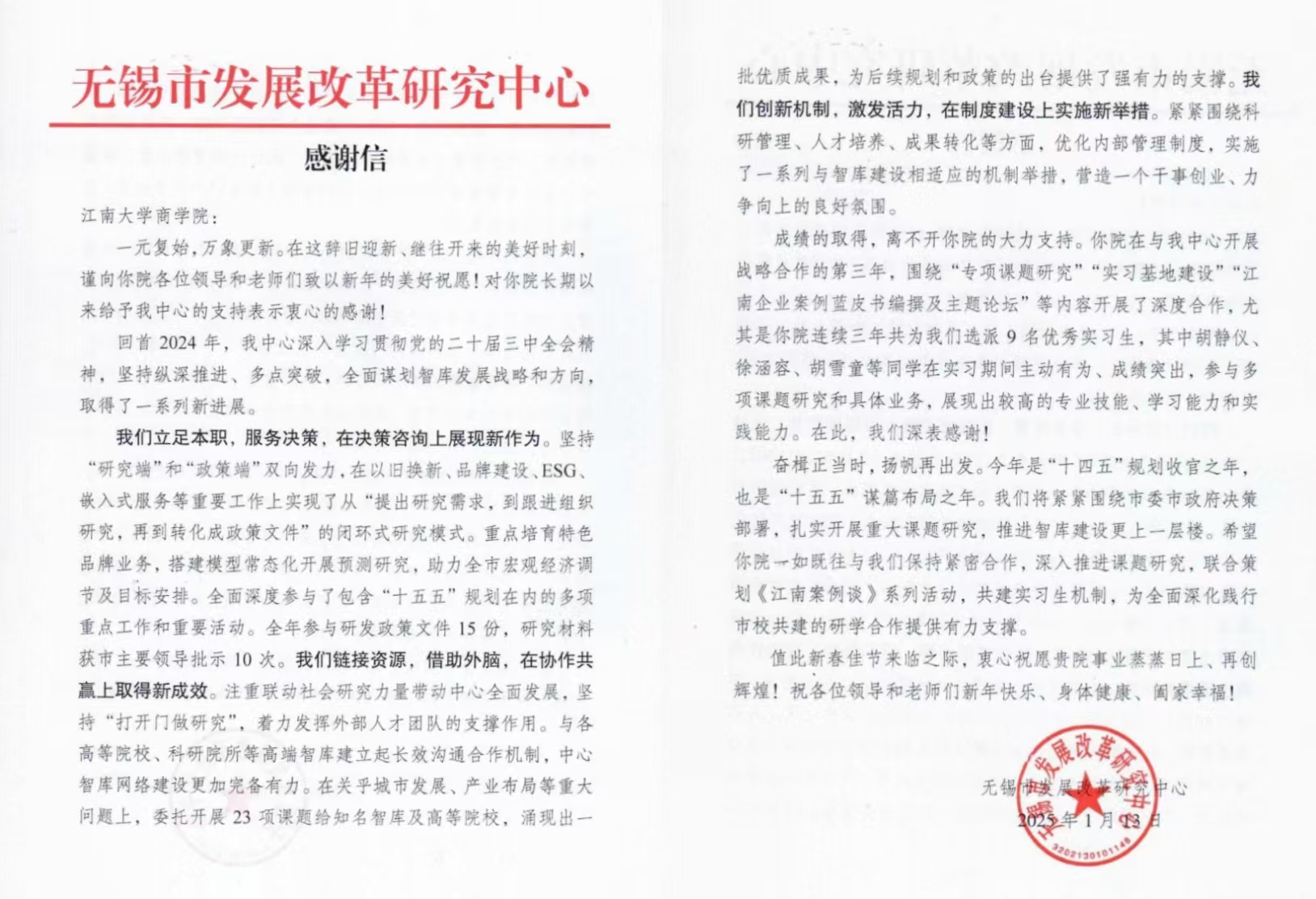 1月13日,无锡市发展改革研究中心特向污污漫画 发来感谢信,对学院为服务地方经济高质量发展提供的智力支持和人才支撑,予以高度肯定和衷心感谢,并向污污漫画 全体教职工致以新春祝福。