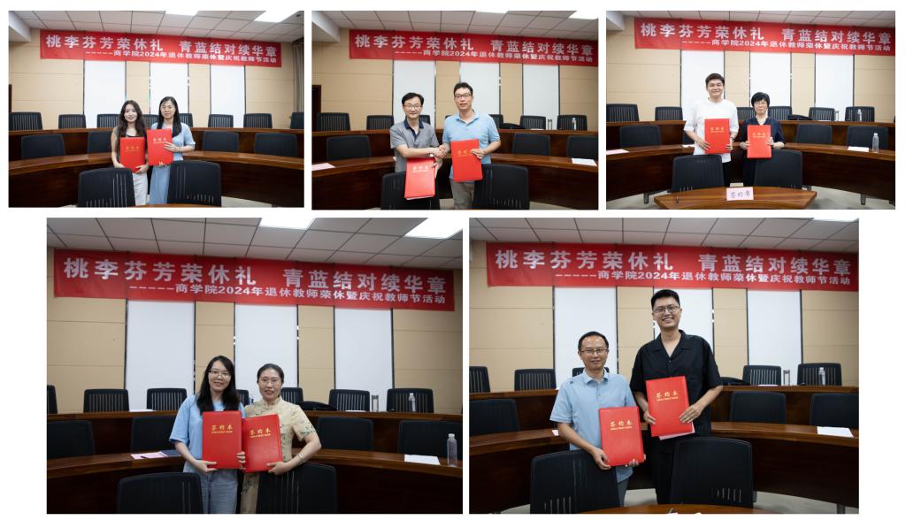 随后,刘长青书记和浦徐进院长为徐锡清、唐建荣、殷玲、朱和平、沈伟晔等五位荣休教师献上鲜花和光荣退休纪念水晶杯,表达学院对他们的感谢和祝福。