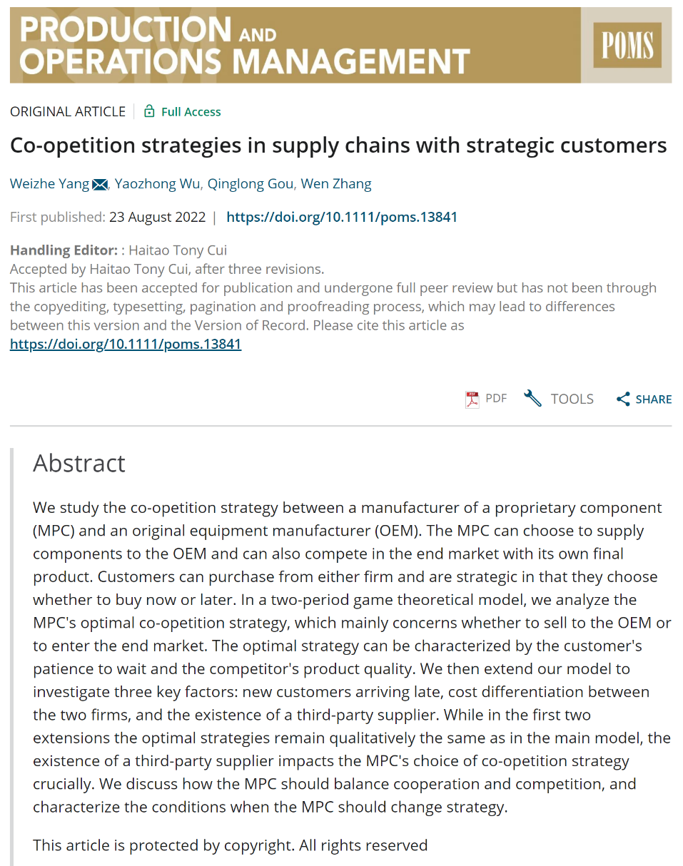 张文博士与中国科学技术大学博士生杨维哲、苟清龙教授以及新加坡国立大学Yaozhong Wu副教授合作的论文“Co-opetition strategies in supply chains with strategic customers”在管理学领域国际顶级期刊《Production and Operations Management》在线发表。Production and Operations Management是美国德克萨斯大学达拉斯分校(University of Texas at Dallas)评定的污污漫画
