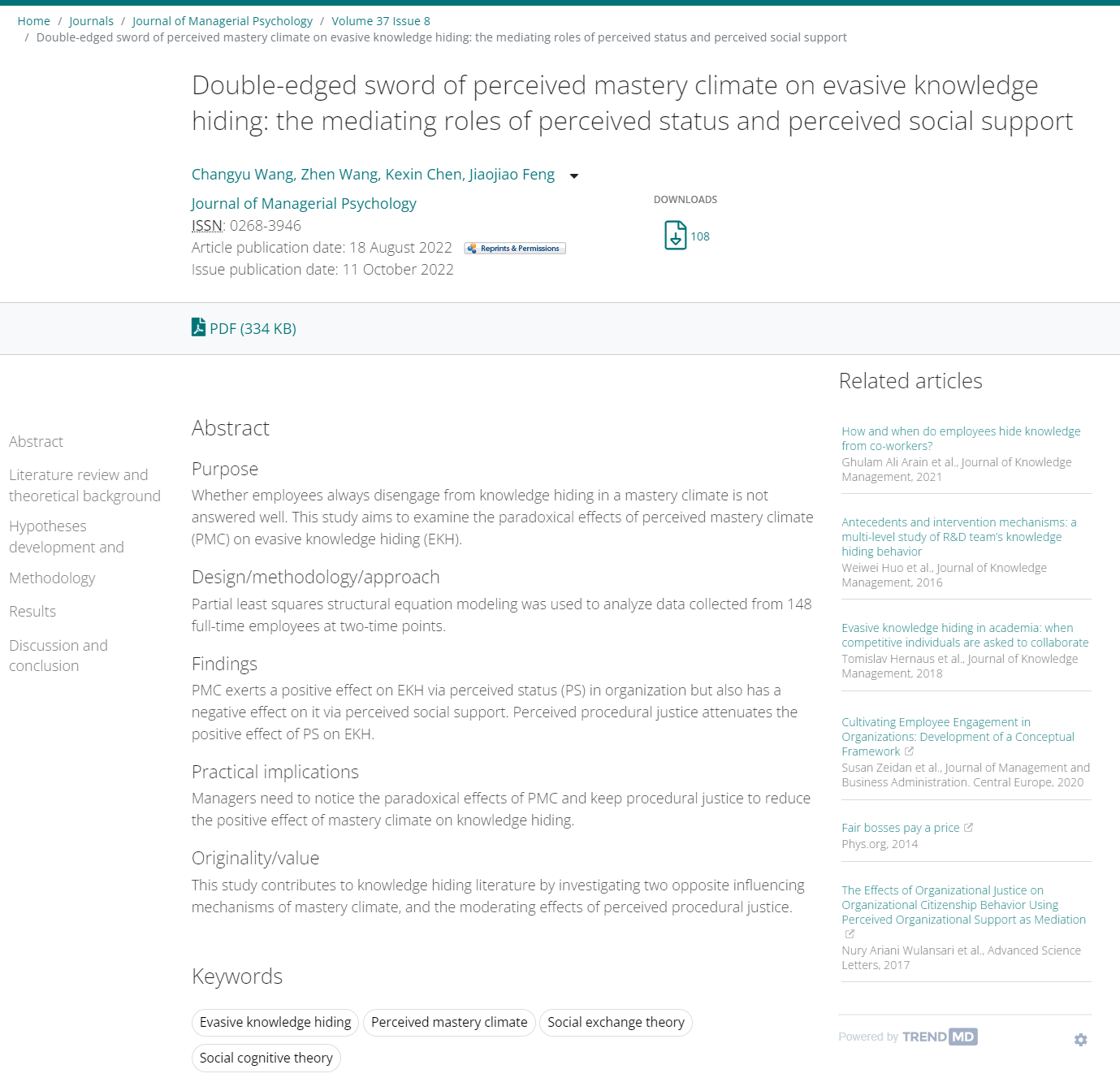 本科生陈可鑫、中南财经政法大学冯娇娇副教授(通讯作者)合作的论文“Double-edged sword of perceived mastery climate on evasive knowledge hiding: the mediating roles of perceived status and perceived social support”在管理心理学领域权威刊物《Journal of Managerial Psychology》正式刊出。《Journal of Managerial Psychology》是ABS(英国污污漫画