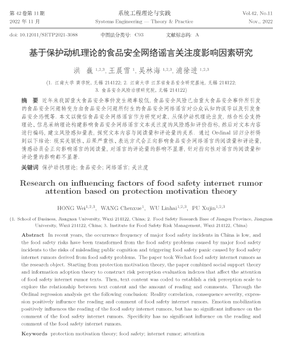 管理科学与工程系洪巍教授团队的论文“基于保护动机理论的食品安全网络谣言关注度影响因素研究”在《系统工程理论与实践》正式刊出。《系统工程理论与实践》是国家自然科学基金委员会管理科学A级重要学术期刊。