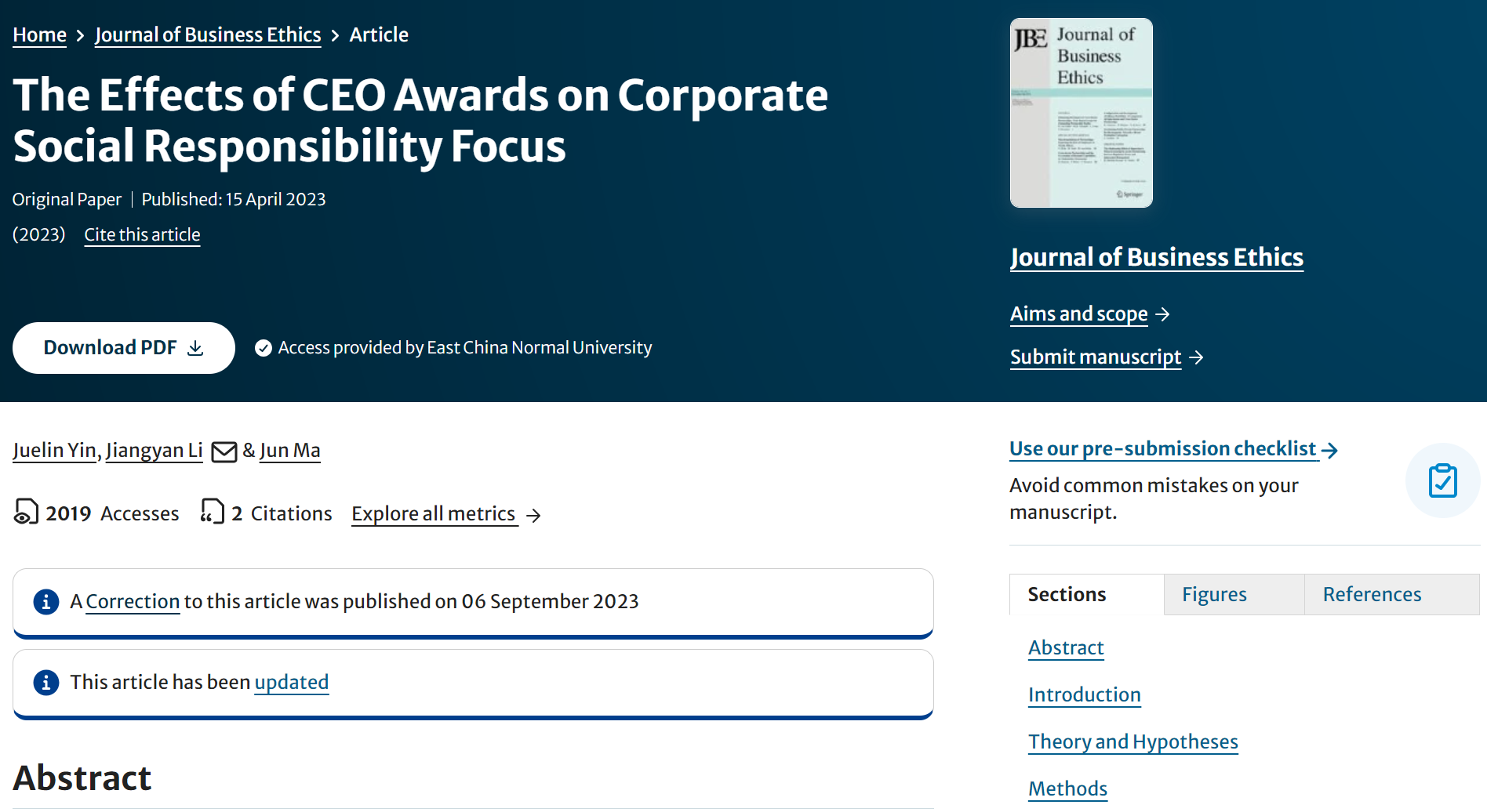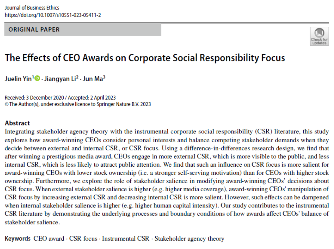 近日,国际权威期刊《Journal of Business Ethics》在线发表了污污漫画 马骏副教授与合作者共同完成的论文“The Effects of CEO Awards on Corporate Social Responsibility Focus”(CEO获奖对企业社会责任关注重点的影响效应)。