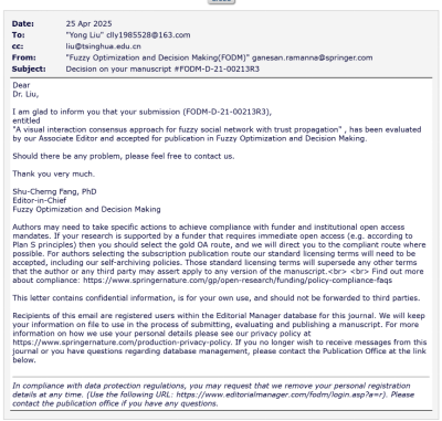 2019级硕士研究生刁维雪为论文第一作者,刘勇教授为指导教师和通讯作者,2020级硕士研究生易锦鸿为第三作者。《Fuzzy Optimization and Decision Making》致力于在不确定条件下的模糊优化和决策理论与实践,涵盖与模糊建模及其相关数学、解法方法和系统相关的理论、实证和实验研究工作,发表有关建模、理论发展、算法发展、系统开发和应用等领域的研究,是管理科学领域高质量期刊之一。该期刊2024年影响因子IF=4.8,是ABS三星期刊。