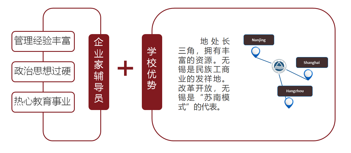 该项目自2013年10月启动至今,通过面向社会公开招募和面试遴选,先后招募了七批、161位企业家担任“企业家辅导员”,主要成员有:卡特彼勒技术研发(中国)有限公司总经理尚尔兵,远东控股集团有限公司党委委员、远东慈善基金会执行理事长周东佼,华泰证券股份有限公司苏州分公司总经理刘晓冰,中国工商银行无锡分行副行长戴政,无锡意凯自动化技术有限公司董事长宋花江,无锡兰德机电工程成套有限公司总经理陈浩,无锡天禧机械设备制造有限公司总经理蒋淑惠,无锡旅游饭店业协会会长黄鉴中,江苏九州七星文化产业有限公司总经理杜翰文,无锡嘉华国际货运代理有限公司董事长周亚南,无锡市润资投资有限公司董事长陈志荣,软件行业协会副秘书长孔天民等。百余位企业家通过开展企业家沙龙、主题班会、名企体验、走进课堂等活动,在大学生思想引领、生涯规划、就业指导、职场角色转变等方面为青年学生予以引领和帮助,深受师生的喜爱。