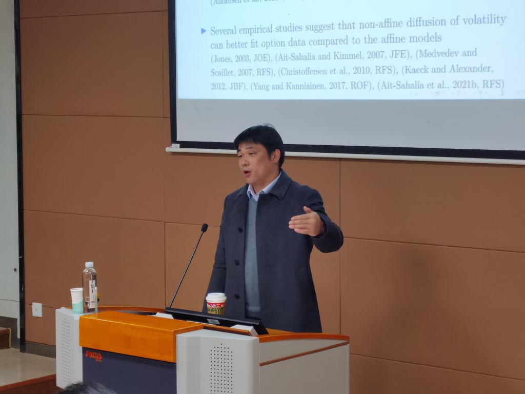 杨念副教授首先介绍了文章的研究动机,简要回顾关于随时间的股票价格跳跃和波动率的相关模型研究,说明由于缺乏分析期权定价公式,限制了利用期权数据对非仿射跳跃扩散随机波动率模型的实证研究。由此提出本文的研究方法,基于疫情前后半年的中国上证50ETF期权面板数据,采用具有正常或双指数跳跃大小,以及具有Heston、GARCH或CEV随机波动率的模型。然后,杨念副教授指出本次研究与以往学者研究前期准备工作的不同,本篇文章引入了惩罚非线性最小二乘估计方法,利用了更多的期权面板数据和实际波动率的信息。