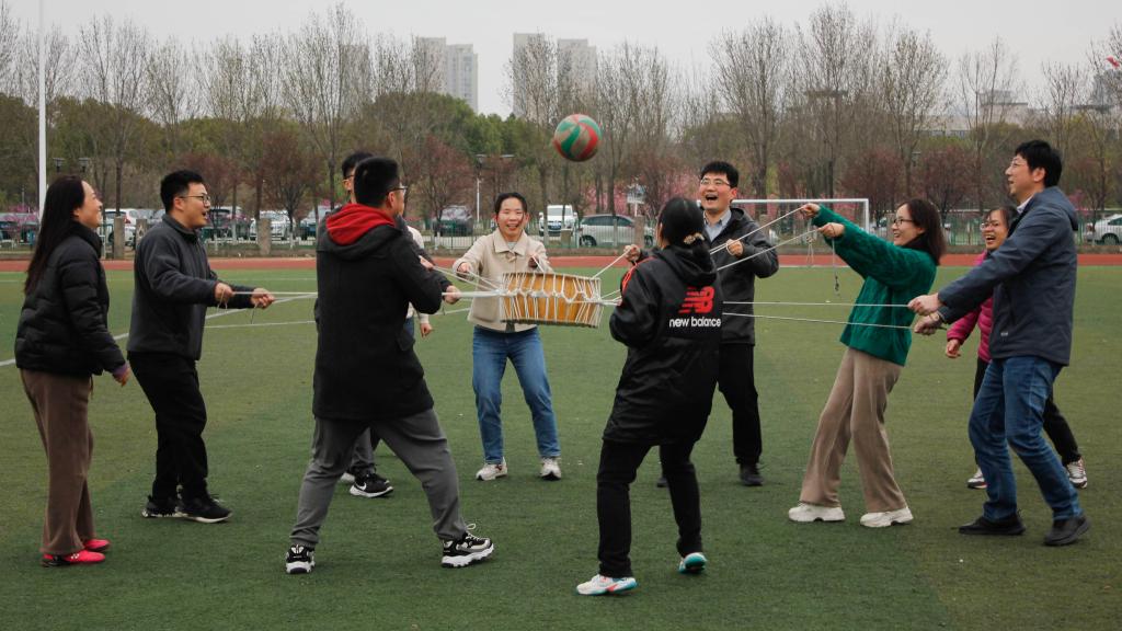 同心鼓项目主要考验团队的协作能力,各参赛团队成员们均匀分布站在鼓的四周,伴随着协调步伐共同移动、有节奏地松拉鼓绳来凝成一股劲,使球在同心鼓上不间断地击打。花毽围踢比赛项目竞争也十分激烈,随着一声“开始”,毽子在空中划出一道道优雅的弧线。各团队教职工们脚步轻盈,眼神专注,随着毽子的起落,欢声笑语此起彼伏,现场充满了生机与活力。