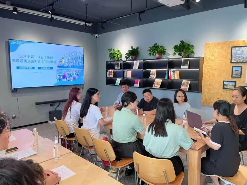 一行走访扬州运河文化投资集团。座谈会上,运河文投集团党委副书记范小平详细介绍了运河文投集团在大运河文化保护传承利用方面的实践。运河大剧院和非遗珍宝馆相关负责人进一步介绍集团项目的建设和运营情况。此外,双方还围绕产学研合作、人才培养等方面进行深入交流。刘长青表示,运河文投集团的生动实践经验给同学们带来深切思考,期待双方能进一步深化合作,共同为大运河文化的传承与发展贡献力量。