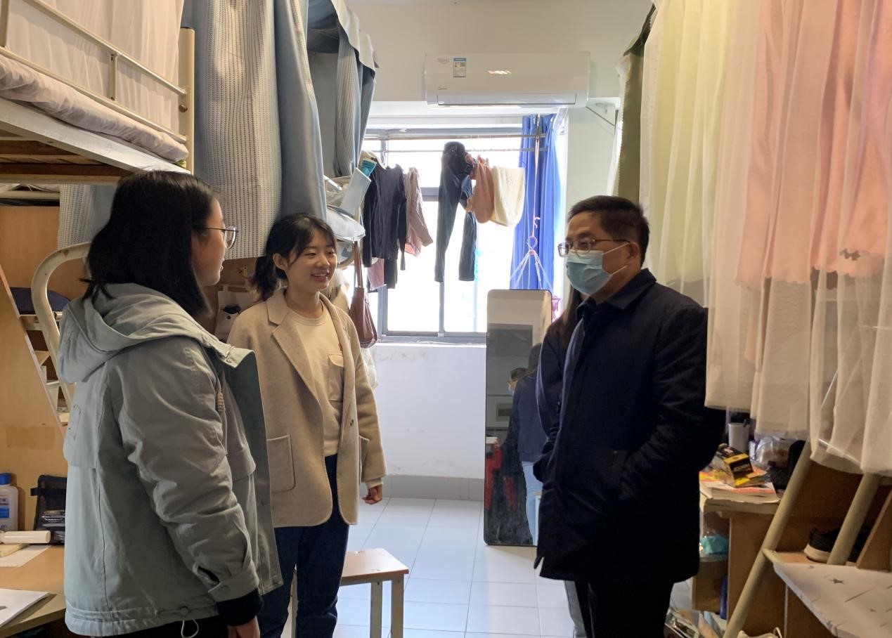 学院领导与走访宿舍学生进行亲切交流,尤为关注当前线上教学、校内生活及困难需求。走访过程中,对于大三、大四年级,着重关心学生的升学就业进展,鼓励其立足实际做好规划、持稳心态两手准备,提醒平衡好教学计划与备考应试之间的时间精力;对于大一、大二年级,询问了解同学们对疫后返校和环境变化的适应情况,叮嘱及时调适心理情绪,抵御外部环境的不利影响。此外,徐锡清书记提醒大家尽快转换状态,全身心投入新学期的学习生活,合理安排学习、科研计划,健康作息、劳逸结合。