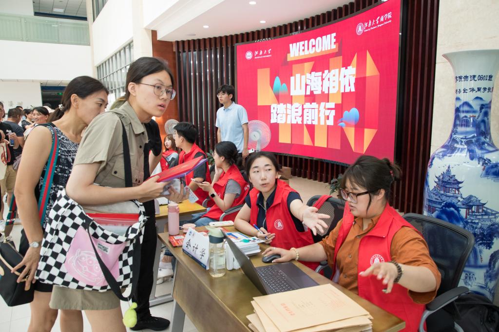 报到现场,学院依托辅导员、学生朋辈集结了多支志愿者队伍,并分专业设置报到点位,快捷有序地引导新生领取报到材料以及进行身份核验。同时,学院设置“新生入学 绿色通道”咨询点位,保障新生入学之路畅通无阻。为丰富新生入学体验,学院策划“我与江南奔现”合影活动,在学院广场主题桁架前设置打卡点位,安排志愿者为新生及家人拍照留念,定格报到美好瞬间。