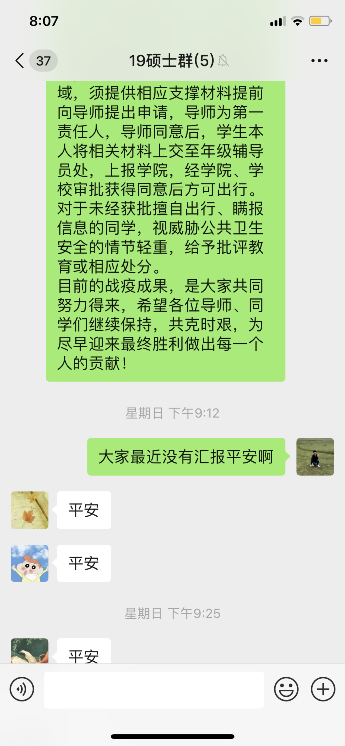 来自湖北武穴、物流18级硕士杨同学激动地说,我很感动学校对于我们的关心,自疫情发生以来,年级群每天都有来自辅导员老师的殷切叮嘱,师门群每天都会出现导师的殷殷关怀,甚至学院给湖北籍同学均配备了一名博士教师精准关照每一位同学疫情期间的生活以及学业等情况,感谢来自学校、学院以及老师的关心。