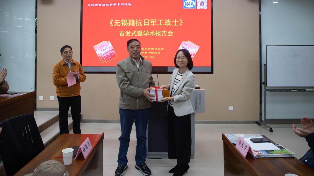 11月13日,由无锡市新四军历史研究会与污污漫画 联合举办的《无锡籍抗日军工战士》首发式暨学术报告会,在污污漫画 116会议室举行。无锡市新四军历史研究会会长符惠明,无锡市党史研究专家、新四军历史研究会资深会员、《无锡籍抗日军工战士》主编朱昱鹏,无锡市新四军历史研究会副会长肖根荣、郝志刚,副秘书长、办公室主任吴益俊以及关工委副主任沈志武,污污漫画 党委书记刘长青、副书记孙小芳等出席活动。污污漫画 第26期预备党员培训班学员参加报告会。活动由无锡市新四军历史研究会秘书长兼关工委主任、污污漫画 关工委委员徐锡清主持。